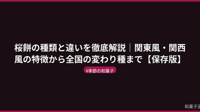 季節の和菓子 桜餅の種類と違いを徹底解説|関東風・関西風の特徴から全国の変わり種まで【保存版】 桜餅の種類と違いを徹底解説。関東風(長命寺)と関西風(道明寺)の特徴・歴史・材料の違いから全国の変わり種まで網羅した保存版です。 2026.03.10 季節の和菓子